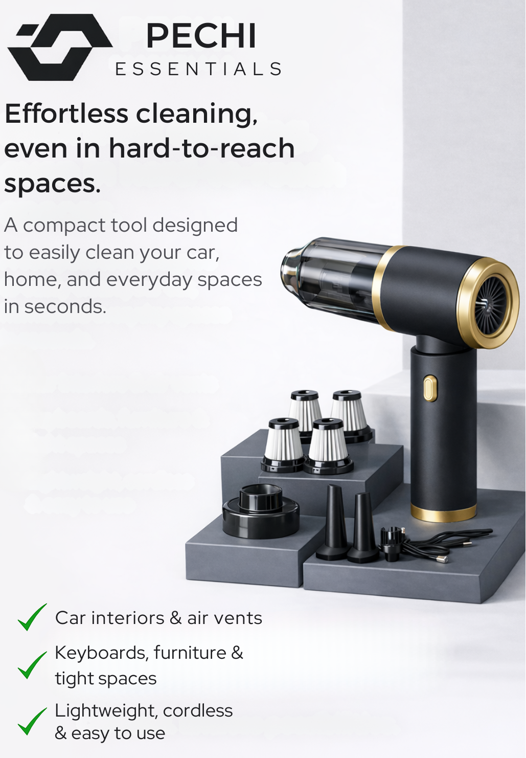 Dust trapped in vents, keyboards, and corners disappears in seconds.